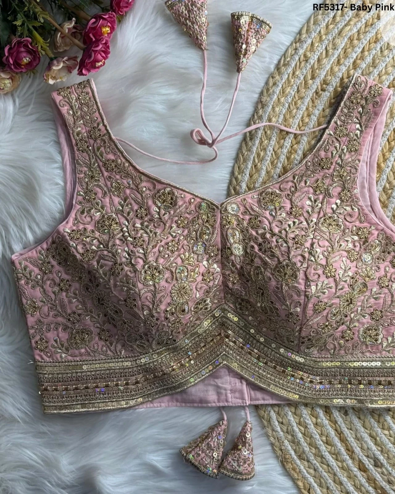 Designer Vichitra Silk Readymade Blouse with Lotus Embroidery & Sequins!
