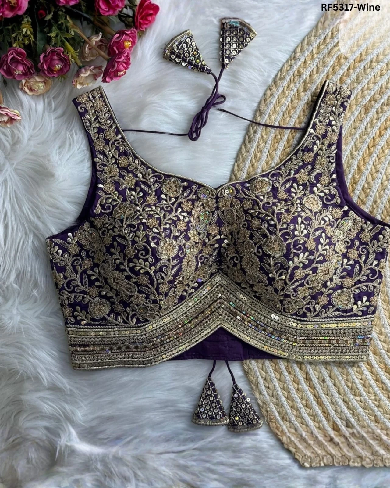 Designer Vichitra Silk Readymade Blouse with Lotus Embroidery & Sequins!