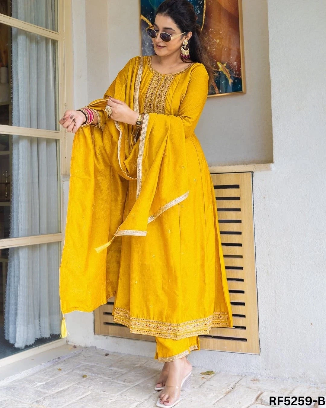 Designer Embroidered Gown Set with Pant & Dupatta – 4 Stunning Shades!