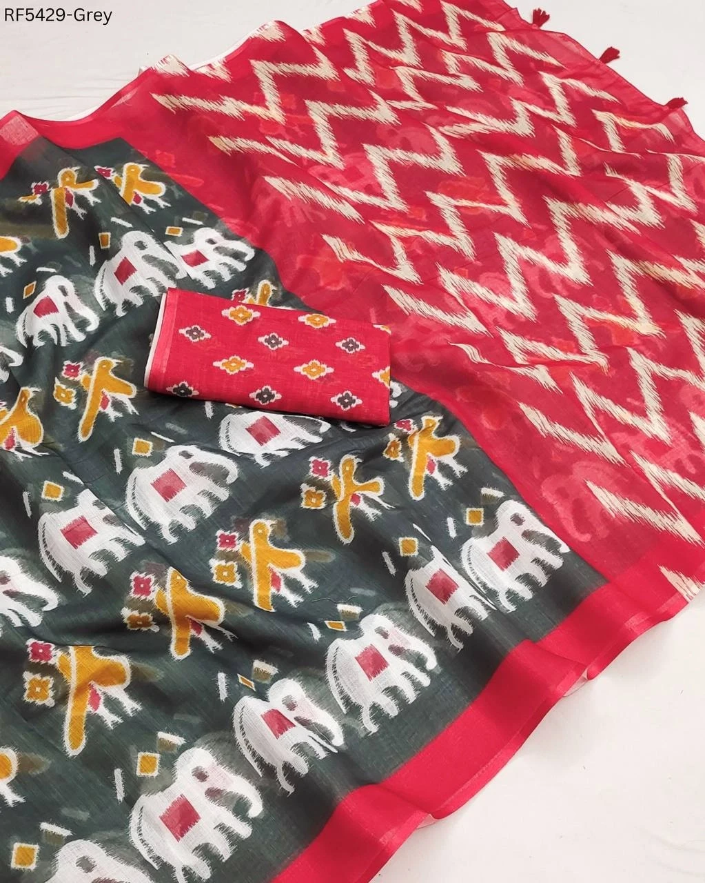 Linen Cotton Printed Saree with Bird Leaf Design Tassels Festive Daily Wear for Women!