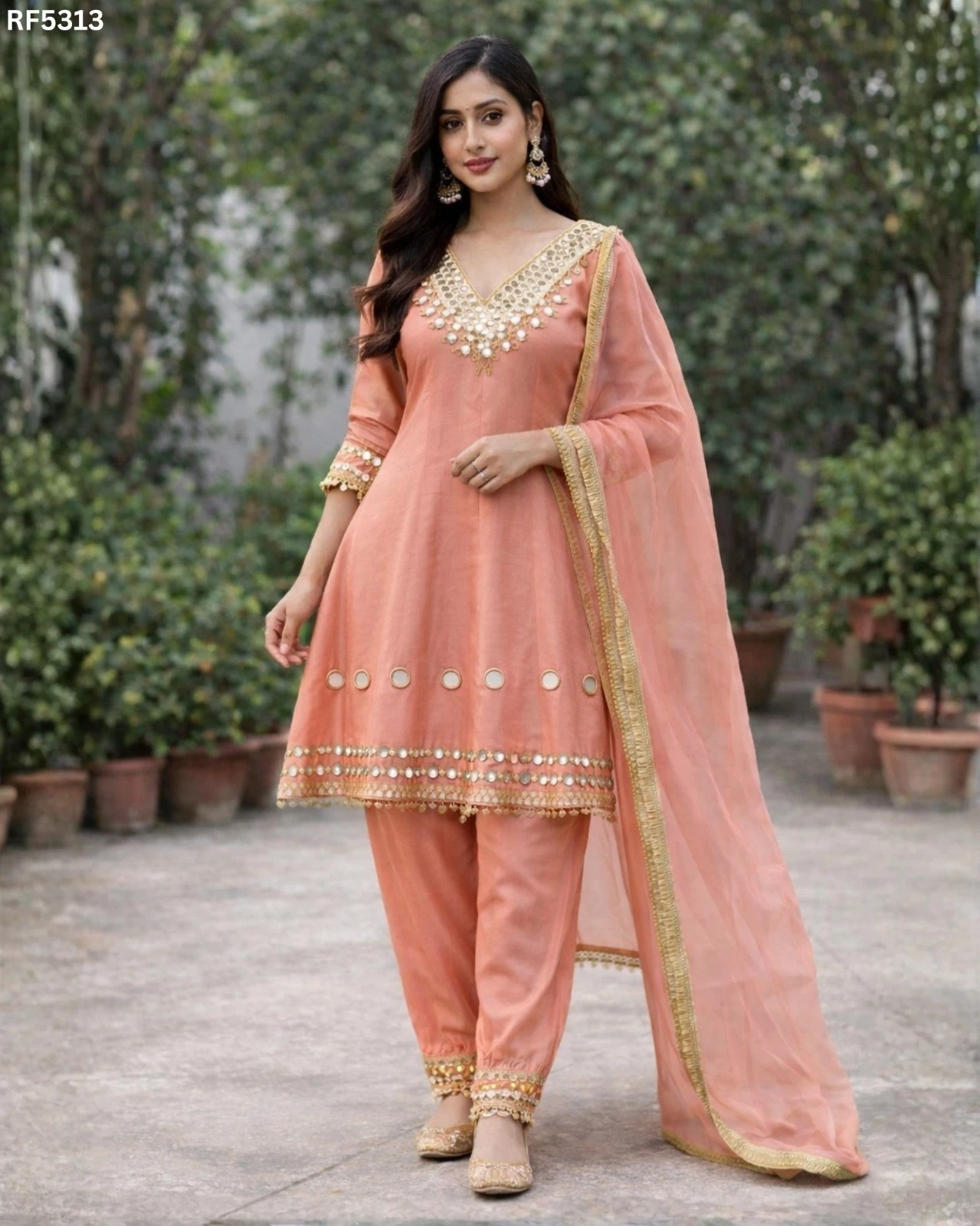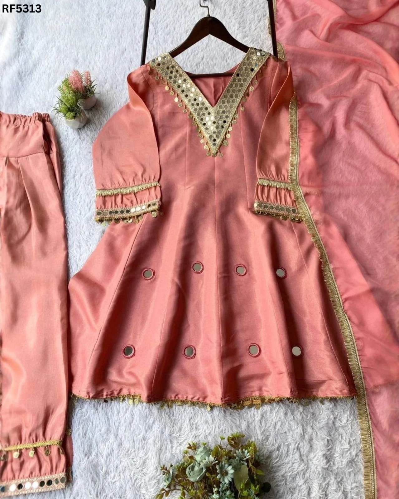 Elegant Roman Silk Kurti Set with Embroidery & Printed Chinon Dupatta!