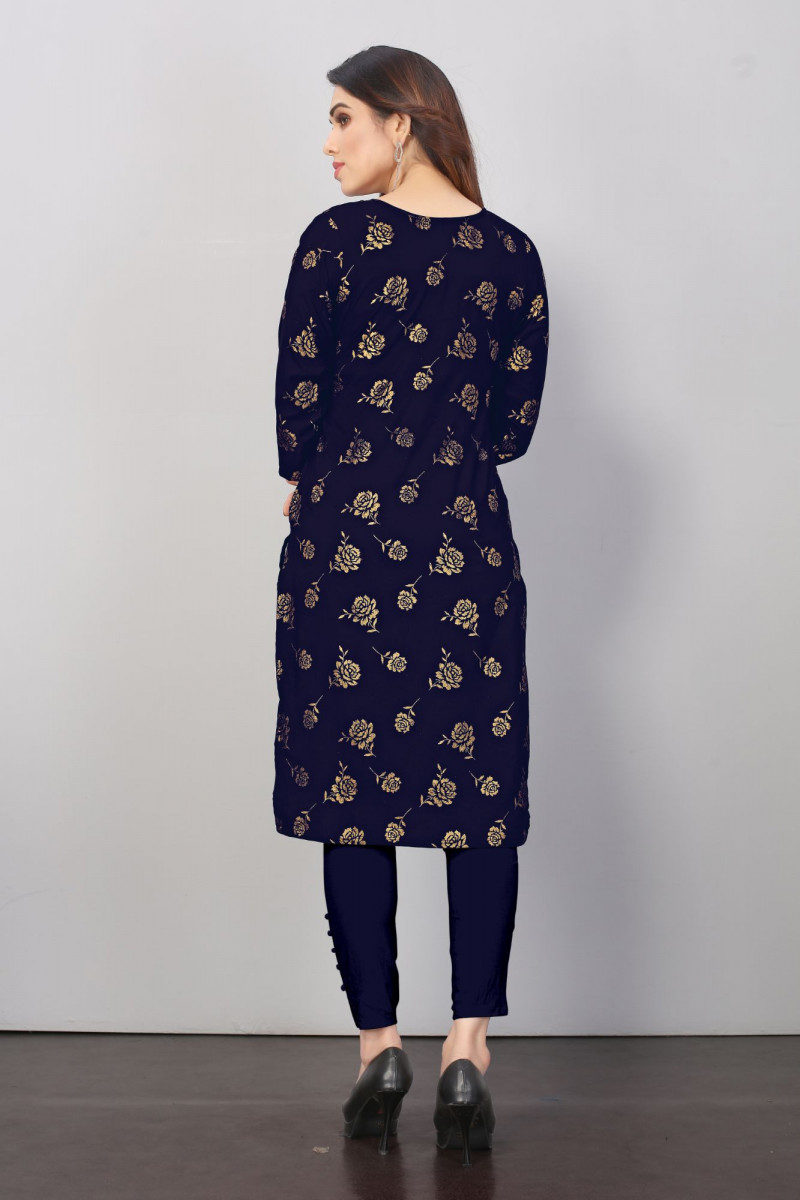Reeta Fashion's Navy Blue Soft Butter Crepe Foil Print Kurti is a perfect blend of traditional elegance and modern style. Made from high-quality crepe fabric, it offers a luxurious feel and drapes beautifully. The intricate foil print adds a touch of glamour, making it ideal for festive occasions or casual outings.